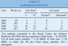 Ear damage was present in 5 per cent of all British servicemen sustaining battle injuries. Tympanicmembrane rupture occurred in 8 per cent of personnel evacuated with blast injuries. In 2006, 1 per cent of servicemen sustaining blast injury underwent audiography; this figure rose to 13 per cent in 2009. Fifty-three per cent of these audiograms were abnormal.