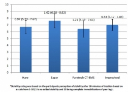 All traction splints performed similarly with regard to the primary outcome measure of mean pounds of traction created at the end of 30 minutes of application with results ranging from 10.4 to 13.3 pounds. There was little difference reported by participants in regard to stability or comfort between the 4 traction devices.